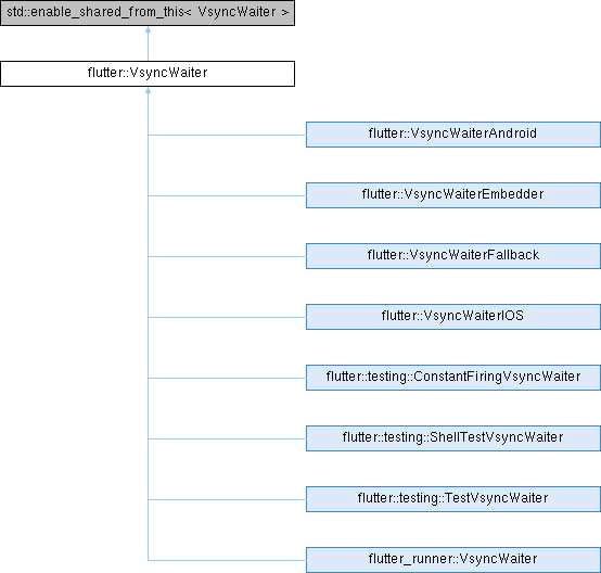 Implemented in flutter::testing::TestVsyncWaiter, flutter::testing::ShellTestVsyncWaiter, flutter::testing::ConstantFiringVsyncWaiter, and flutter::VsyncWaiterIOS.