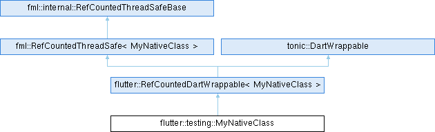Public Member Functions inherited from flutter::RefCountedDartWrappable< MyNativeClass > | |