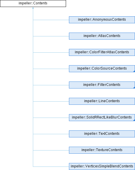 Implemented in impeller::AnonymousContents, impeller::AtlasContents, impeller::ColorFilterAtlasContents, impeller::CircleContents, impeller::ConicalGradientContents, impeller::FilterContents, impeller::LineContents, impeller::LinearGradientContents, impeller::RadialGradientContents, impeller::RuntimeEffectContents, impeller::SolidColorContents, impeller::SolidRRectLikeBlurContents, impeller::SweepGradientContents, impeller::TextContents, impeller::TextureContents, impeller::TiledTextureContents, and impeller::VerticesSimpleBlendContents.
